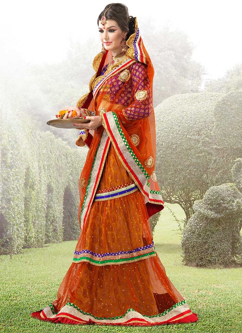Here we are sharing a gorgeous Indian Bridal look were you can see a newly wed Hindu bride in a flary orange lehanga along with net dupatta and navy blue full slveed choli. This color combination of orange with navy blue is very much in fashion these days.