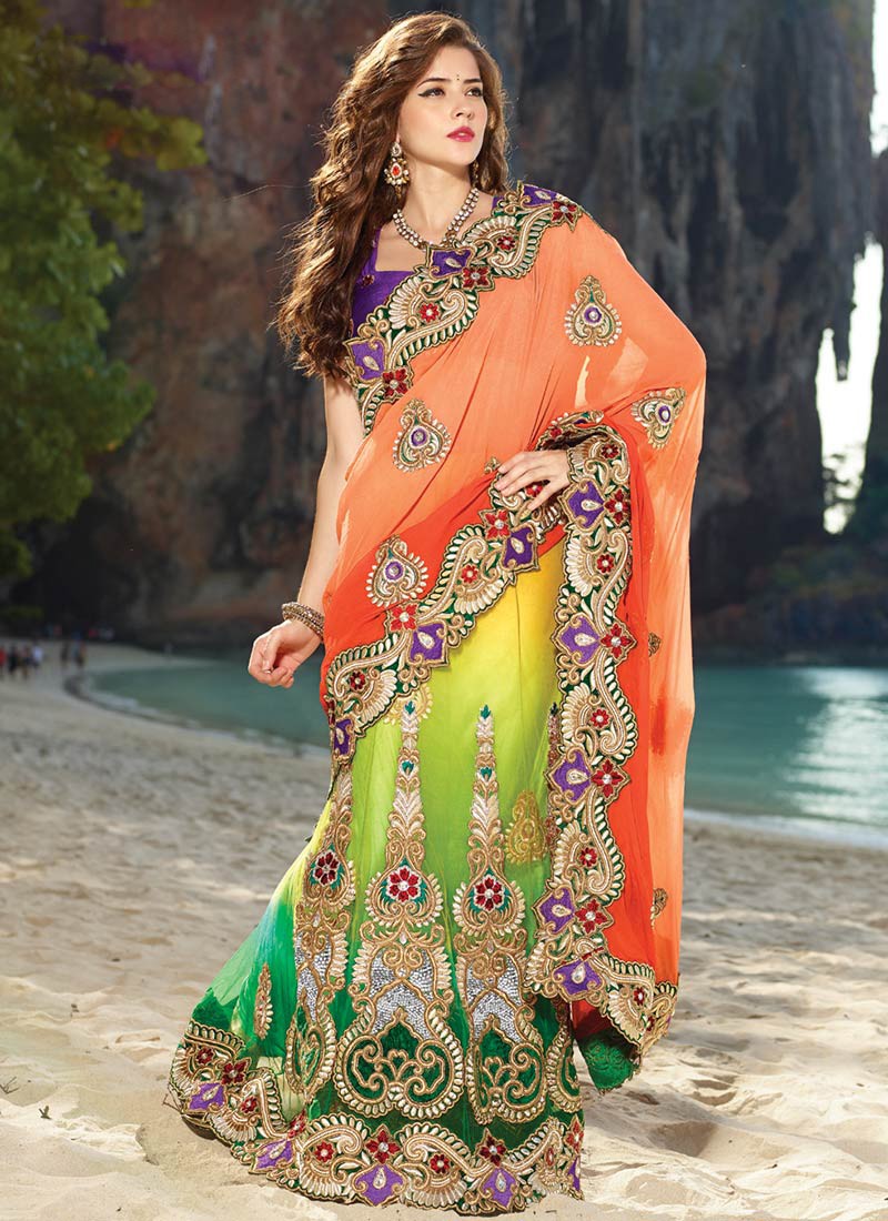 Hello all! We loved this color combination of blue, peach, green and yellow sari which we think would love wonderful on any bride to be. Anyone who wants to purchase a wonderful and beautiful sari for her wedding can opt for this kind of gorgeous sari with cut work on pallu.