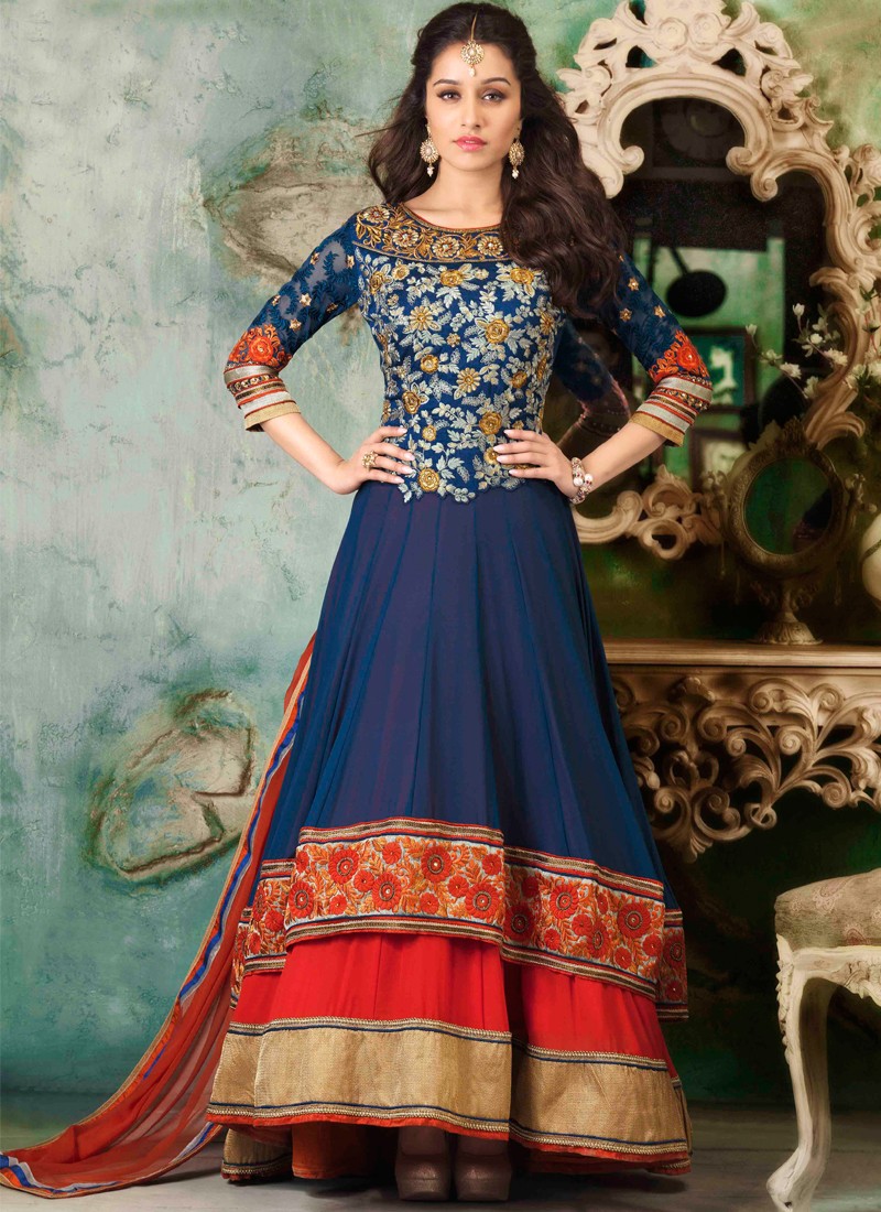 We love this floor length anarkali elbow sleeves suit on Bollywood actress Shraddha Kapoor. Without a doubt the actress look super beautiful in this floor length blue and red combination anarkali. We love her matching jewelry too which gives a beautiful feel of Indian bride. This suit would look good for any occasion like party, festival, engagement, wedding etc.