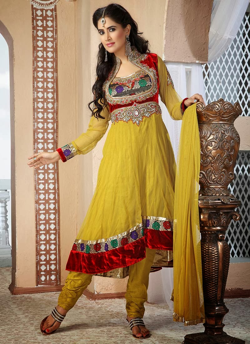How many of you like yellow color? Very recently, this color has entered into my list of favorite colors and its such a kind of color that looks very pretty on every dress, be it on Indian ethnic wear or western wear. Now a days also the yellow color is in vogue and any bride to be can opt for a beautiful yellow color suit on her sangeet night. I loved this yellow color short anarkali with choli style, matka neck cut and net sleeves. Do you like this yellow suit? Yes or no? 🙂