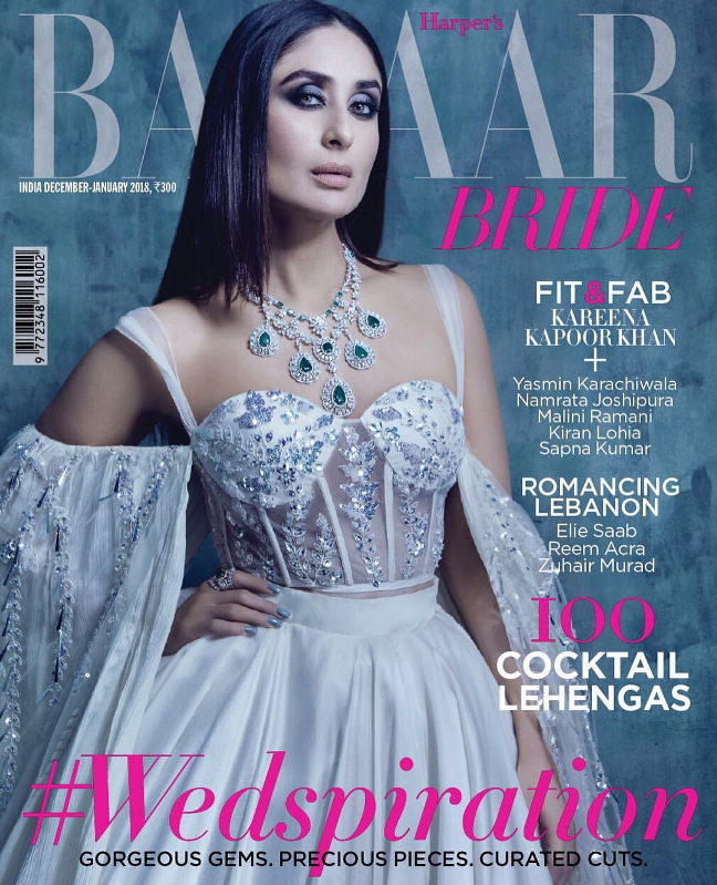 Kareena Kapoor Covers Harper’s Bazaar Dec-Jan 2018 issue wearing a white gown by Manish Malhotra. She will be seen in a smokey eye makeup look which she finished off with center partitioned straight hair and a diamond statement necklace. Kareena looks classy on this Harper’s Bazaar Bride issue! What say?
