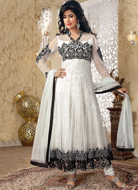 This Black and White Anarkali suit is without a doubt a beautiful creation which makes me fall in love with anarkali suits again and again. Its no doubt that the combination of black and white is the best any point of time and this anarkali justifies the same. What I like the most about this anarkali is the lacy hemline of its kurti which makes this particular piece an “Eye Candy”.