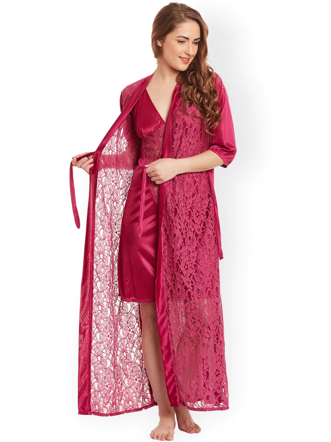 - Claura – Burgundy Lace Satin Nightdress with Lace Robe ST-17