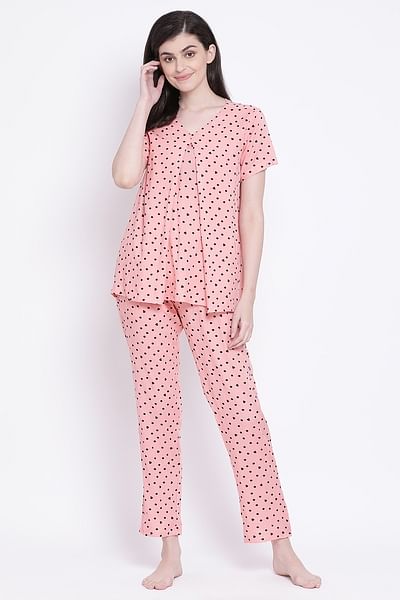 - Clovia – Feeding Polka Print Layered Top & Pyjama in Peach- Rayon
