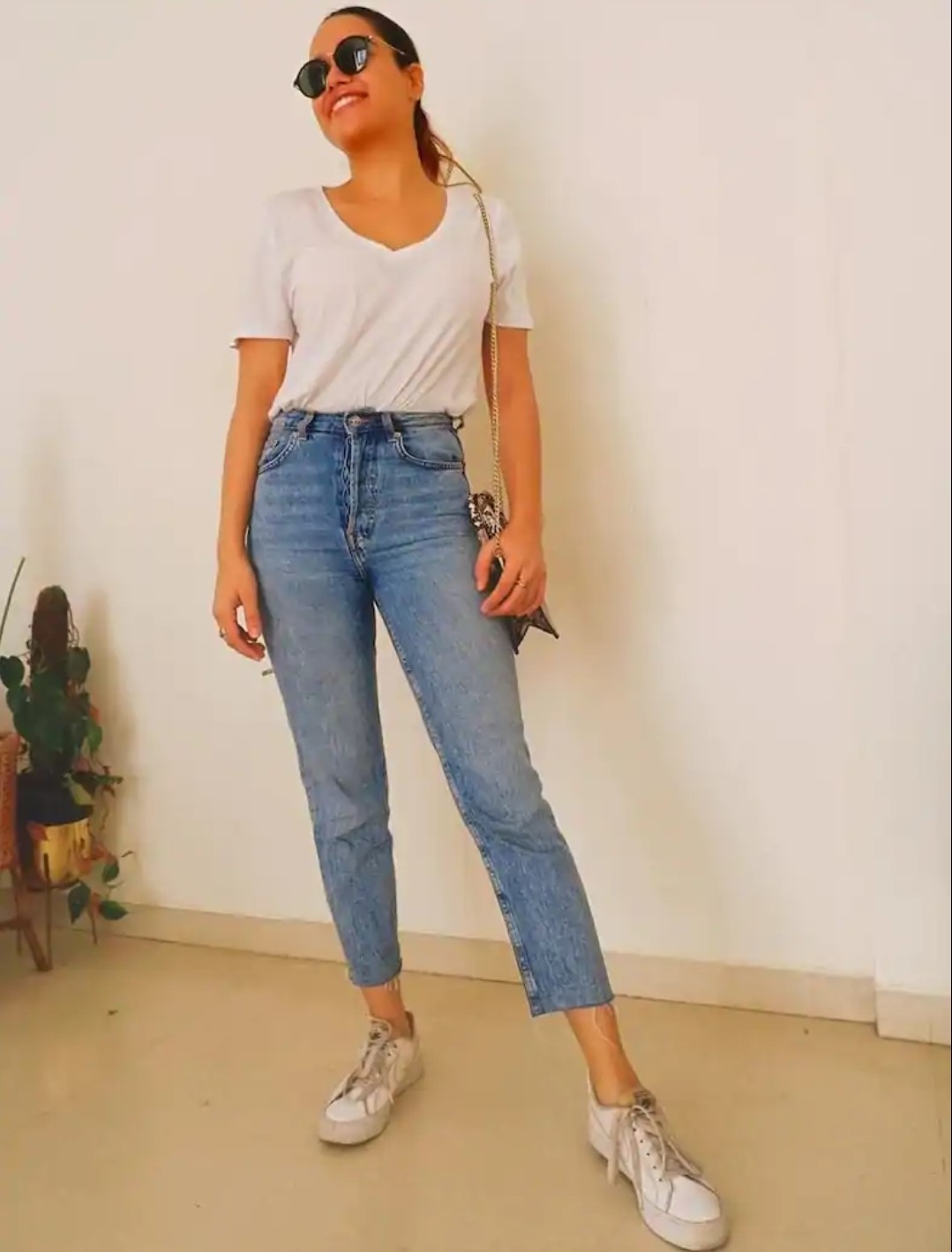 A white t-shirt with blue jeans is the perfect basic outfit! Debasree Banerjee says whenever in doubt, this pick is sure to be your saviour. She styles this look with a MANGO Women Solid V-Neck t-shirt, Roadstar Women Slim Fit Jeans, Royal sun, Unisex Round Sunglasses, Highlander Men Sneakers. You can easily make this your go-to style any day, every day. All you need is a pair of good denim and cute tees that you can swear by. Voila! You will get a Debashre Banerjee-inspired look right there.