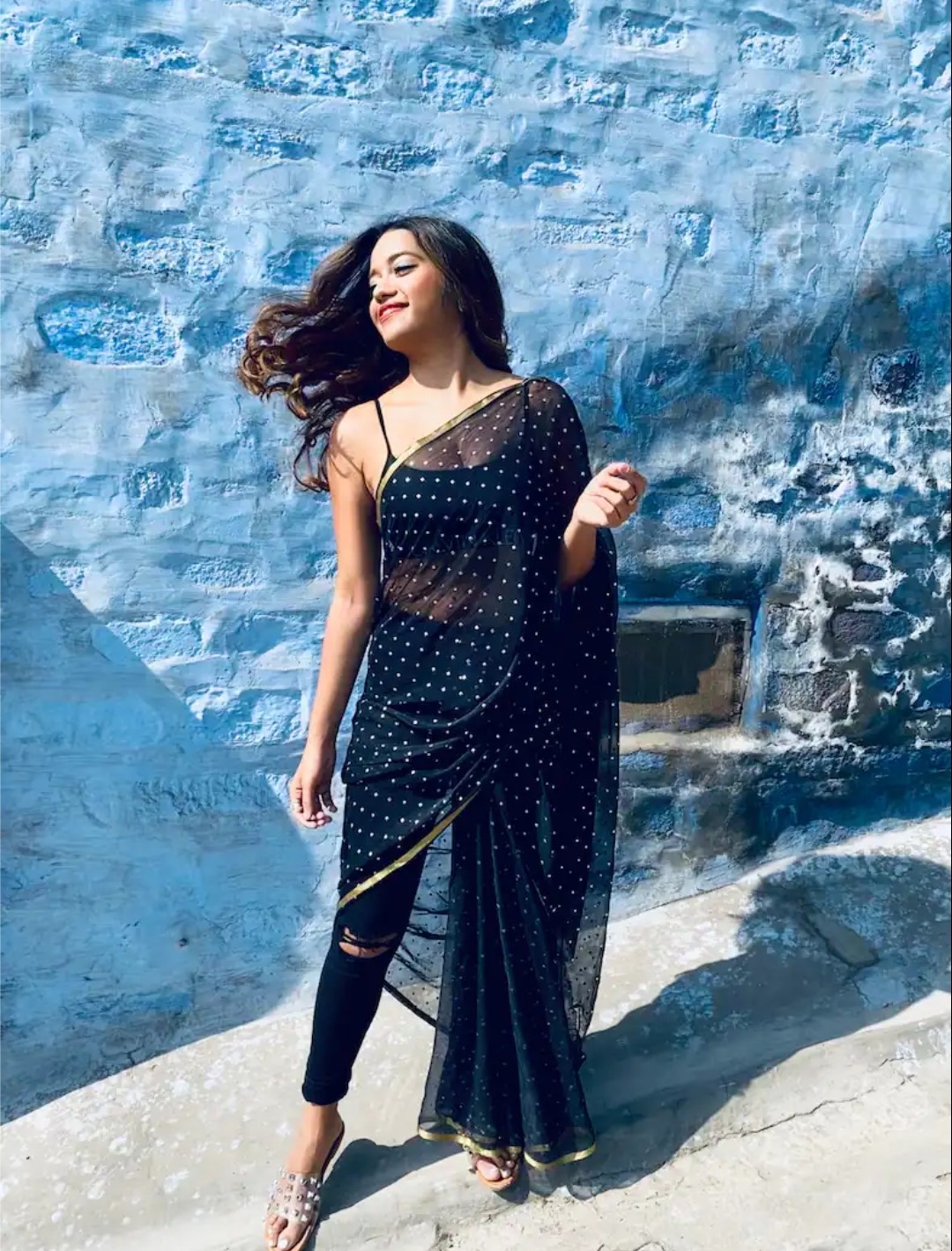 Debasree Banerjee unconventionally reinvents the traditional saree. Styling the outfit with Tikhi Imli Embellished Saree with Here and Now, Women Skinny Fit Jeans to get ready for this festive season. Other similar outfits you can go for are Soch Solid Saree, Sugathari Solid Saree, etc.