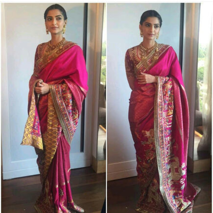 This dark pink sari by Abu Jani Sandeep Khosla which …